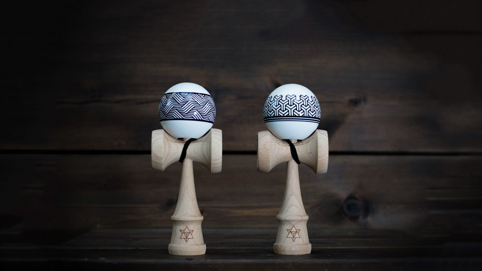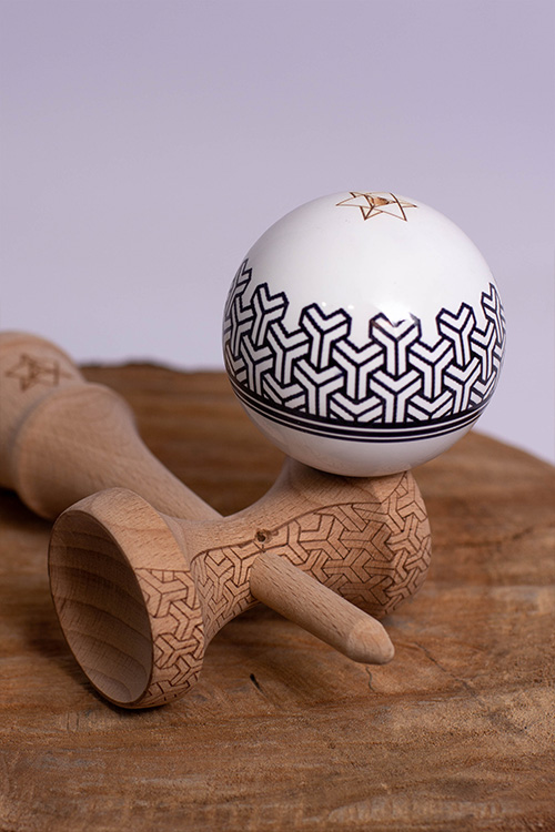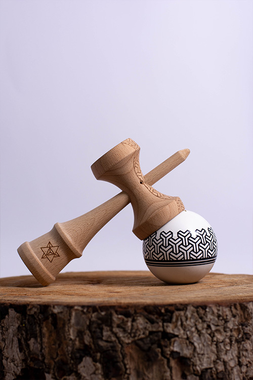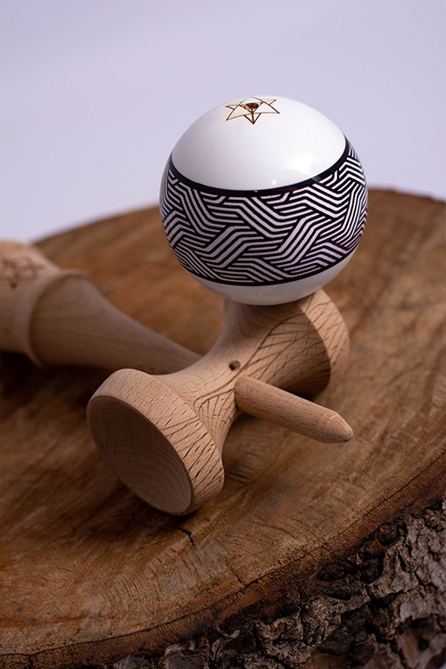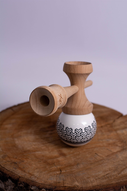 The new KINTSUGI & IKIGAI made from high-quality beechwood, Big Brother PHASE II shape, clean white tama with black geometric design, coated with SHEKEL Clear!